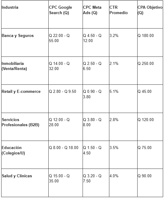 Desde la agencia Web Marketing (https://webmarketing.com.gt/), presentamos este reporte anual detallando los costos promedio por clic (CPC), tasas de conversión (CVR) y costos por adquisición (CPA) en las industrias más competitivas de la región.